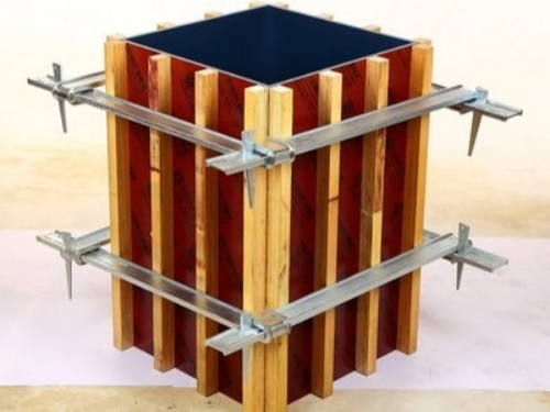 方柱扣加固件的組成。方柱的鋼筋是由4塊鋼板和4塊鐵楔組成。每個卡板的一端是u形彎頭,另一端滿是兩排準確尺寸的方孔。四塊鋼卡板通過肘部的交互鏈接固定在方柱模板周圍。將四塊楔形的鐵塊壓入夾板末端的方孔中,以擰緊模板。