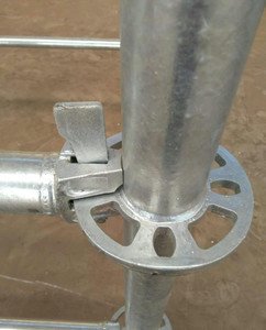 2、圓盤腳手架配件都準備好后,安裝時只需將橫桿接頭對準菊花盤位置,然后用手將插銷插入菊花盤孔并穿出接頭底部。